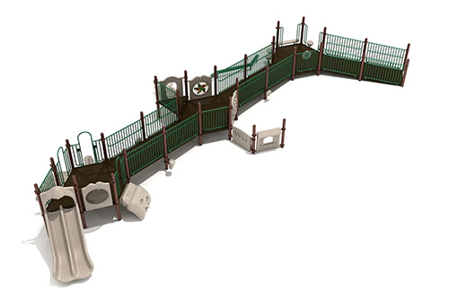 Many of the outdoor playgrounds we supply already have Transfer Stations built in for less abled children, but the Mount Rainer playset goes above and beyond with an entire ADA Ramp platform section which is wheelchair and mobility aid accessible. Along the length of the decking ramp there is a Metal Barrier with Ship’s Wheel for pirate adventures, a Gear Panel to inspire creativity and educate, plus a Bubble Panel to look out of. Children can opt to use the Wave Slide or Double Slide to get down, and the Pebble Climbers, Sea Creature Climber and Carrot Climber to get up again. Around the edge of the structure there are numerous fun activities which are also wheelchair accessible including Bongos, a Single Drum and Double Drum for music making. There’s also a Balance Beam to one side as well as a Bench Climber and Store Panel for creative play.