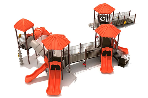 Three ADA Ramps make the Riverbend Run fully compliant and accessible for less abled children so they can have just as much fun. Five slides can be found on the structure including two Double Slides, a Right Turn Slide, a Wave Slide and a very long and twisty Curved Tube Slide to zoom down. Two different styles of Boulder Climber encourage motor skill development as well as stimulating the imagination as they cling on to the side of a cliff, but there are many other ways to get up including a Pebble Climber, a wobbly Wavy Snake Climber and a Pod Climber too. Two Rain Wheels and two Ship’s Wheels complement a larger Lookout Deck with Ship’s Wheel so multiple children can set a course along a river or out to sea. Games can be played again and again on the interactive Tic Tac Toe Panel, a Maze Panel helps problem-solving abilities and Gear Panel is ideal for discovering cause-and-effect movements.